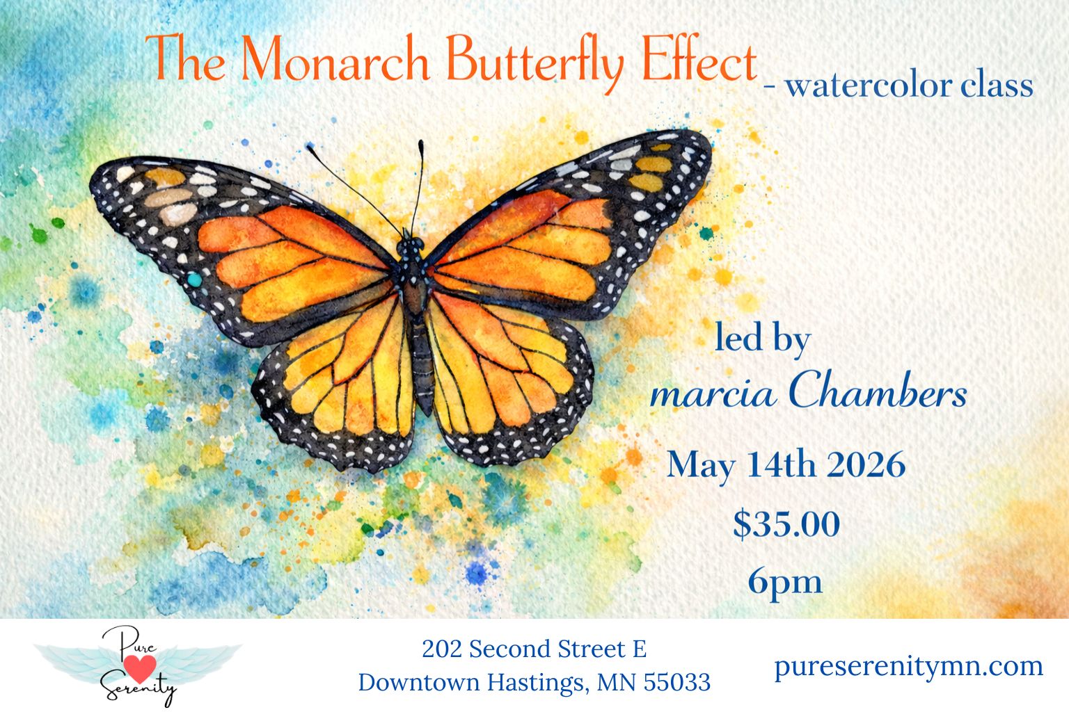 Pure Serenity Wellness Center 202 2nd Street East, Hastings, MNEvent Description To honor National Monarch Butterfly dayMarcia Chambers, Inner Wild Woman Studio https://www.innerwildwomanstudio.com/will be facilitating a monarch butterfly painting class. Each year on the first Saturday in May, National […]